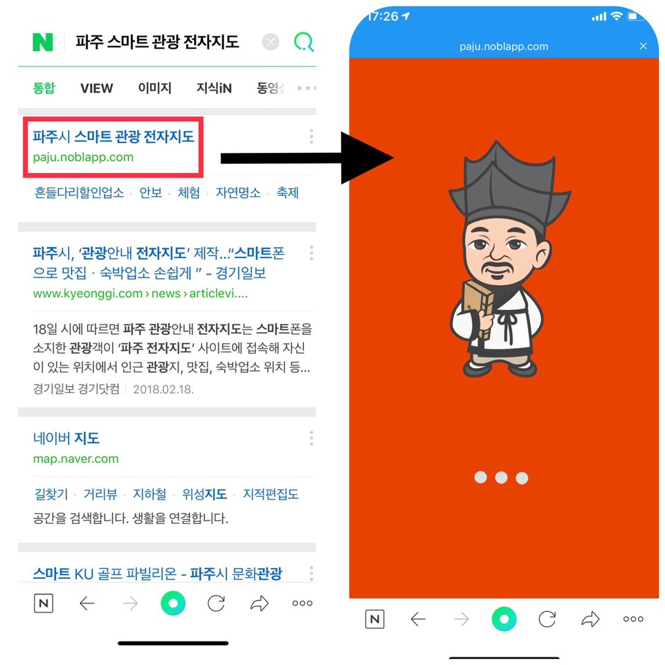 인터넷 포털사이트(ex.네이버·다음·구글 등)에 접속해서 검색창에 '파주 스마트 관광지도'를 입력해 검색하면, 가장 최상단에 있는 노블앱 주소링크를 클릭해 접속하실 수 있습니다.
