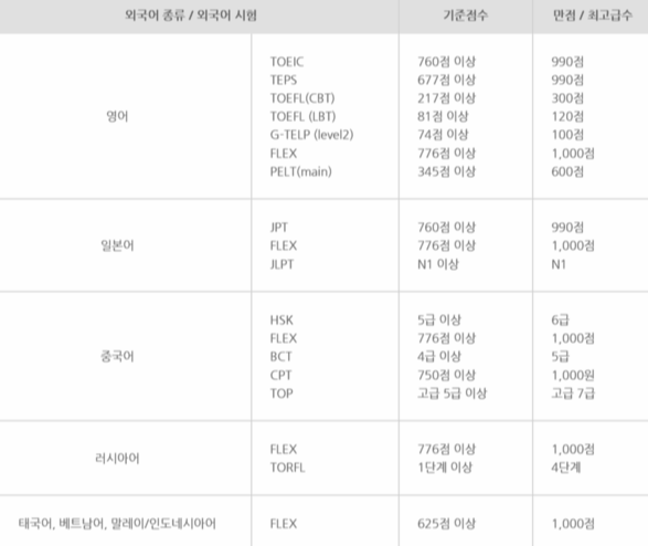 아래는 해당 외국어의 합격기준표이니 참고 바랍니다.