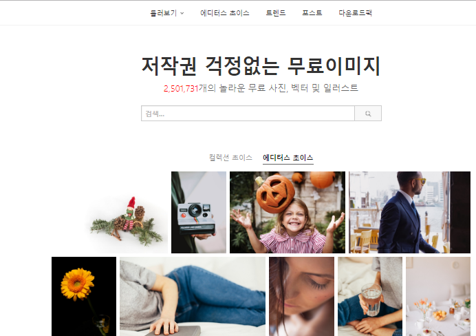 전부 무료이미지로 사용 가능, 그리고 벡터 및 일러스트도 존재하며 트렌드 사진도 나뉘어져 둘러보기 쉽게 되어있습니다. (한글로 되어있음)