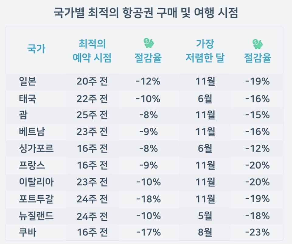 나라별로 최적의 예약시점과 저렴한 달, 절감율에 따른 정리표입니다. 여행시 참고하셔서 미리 예약하면 꽤나 많은 절감이 가능할듯 해요.