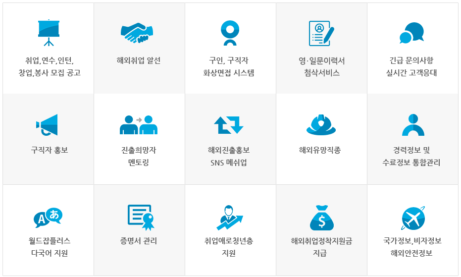 해외취업을 위한 연수과정과 구인 or 구직자들을 대상으로 서비스들을 제공하고 있는데, 결론은.. 개인이 운영하는게 아닌 정부에서 운영하는 취업포털이라 믿고 볼만합니다.
