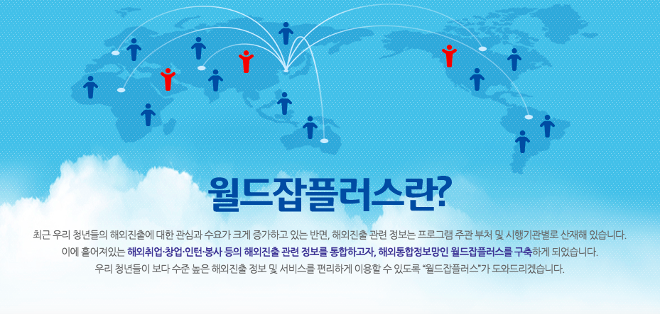 다른 프로그램 주관 부처 or 시행기관별로 산재해있지만 흩어져있는 해외진출(취업/창업/인턴 등)의 관련 정보들을 통합하여 만든 곳이 바로 월드잡플러스