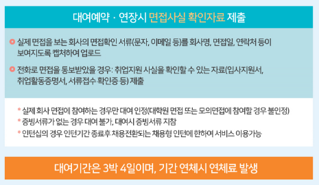 그리고 만약 대여예약/연장을 원할 경우 면접사실 확인자료 제출이 반드시 필요합니다!