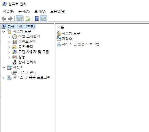 그 중에서 '관리'를 눌러주면 위 화면과 같은 컴퓨터 관리창이 나오게 됩니다.