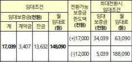 - 최대보증금▶ 보증금 한도액을 최대(+17,000,000)로 설정하면 최대보증금(34,089,000원)이 되므로 그 차액(30,632,000)을 납부하여 월 63,090원의 임대료를 납부하게 됨.