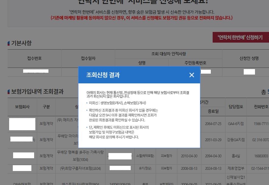 본인이 가입된 보험가입내역이 조회가 됩니다.