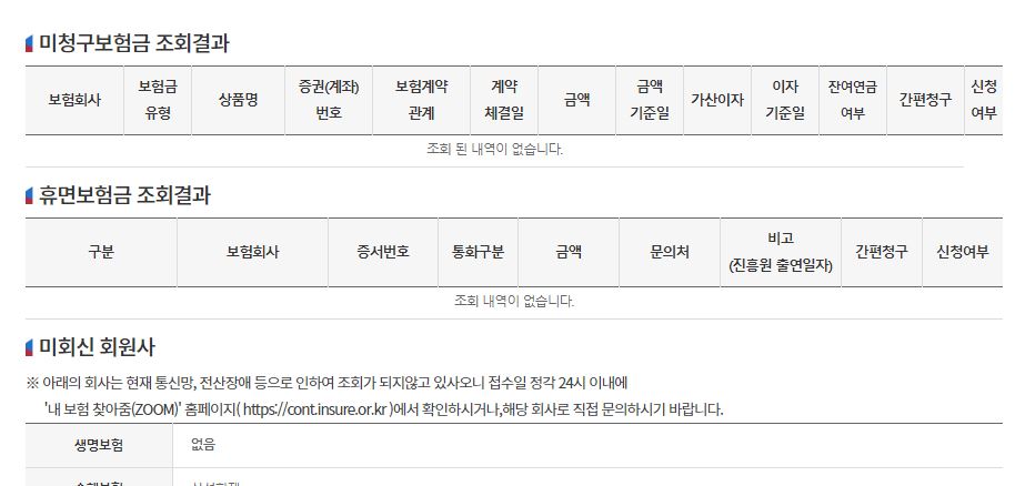 그 아래로 스크롤을 쭉 하시다보면 미청구보험금 및 휴먼보험금 조회결과가 나타나는데 저는 숨은 보험금이 없는것으로 확인 되었습니다.