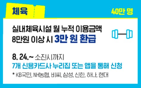 - 1개월 이내 민간 실내체육시설 결제금액이 8만 원 이상 누적 시, 3만 원을 지원