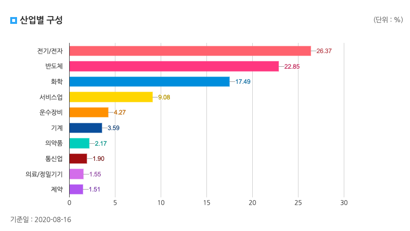 산업별 구성 비중은 전기/전자(1위), 반도체(2위), 화학(3위), 서비스업(4위), 운수장비(5위), 기계(6위), 의약품(7위), 통신업(8위), 의료/정밀기기(9위), 제약(10위)입니다.
