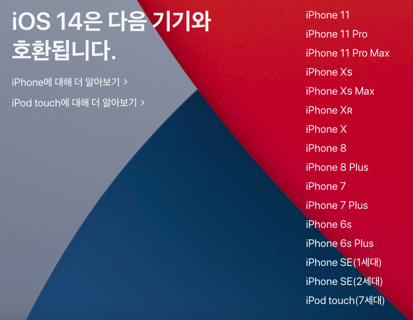 iPhone6s 이상의 기기 부터 iOS 14 업데이트가 가능한데요, 지원되는 기종은 다음과 같이 나와 있습니다.