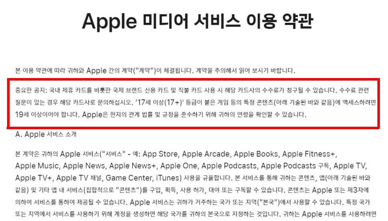 사실상 가장 크게 애플페이가 도입될 수 있다는 사실에 대한 유력한 단서는 위 사진에서 보이는 애플 미디어 서비스 이용약관 내용이 중요한 공지로 추가되었기 때문이라고 추측할 수 있습니다.