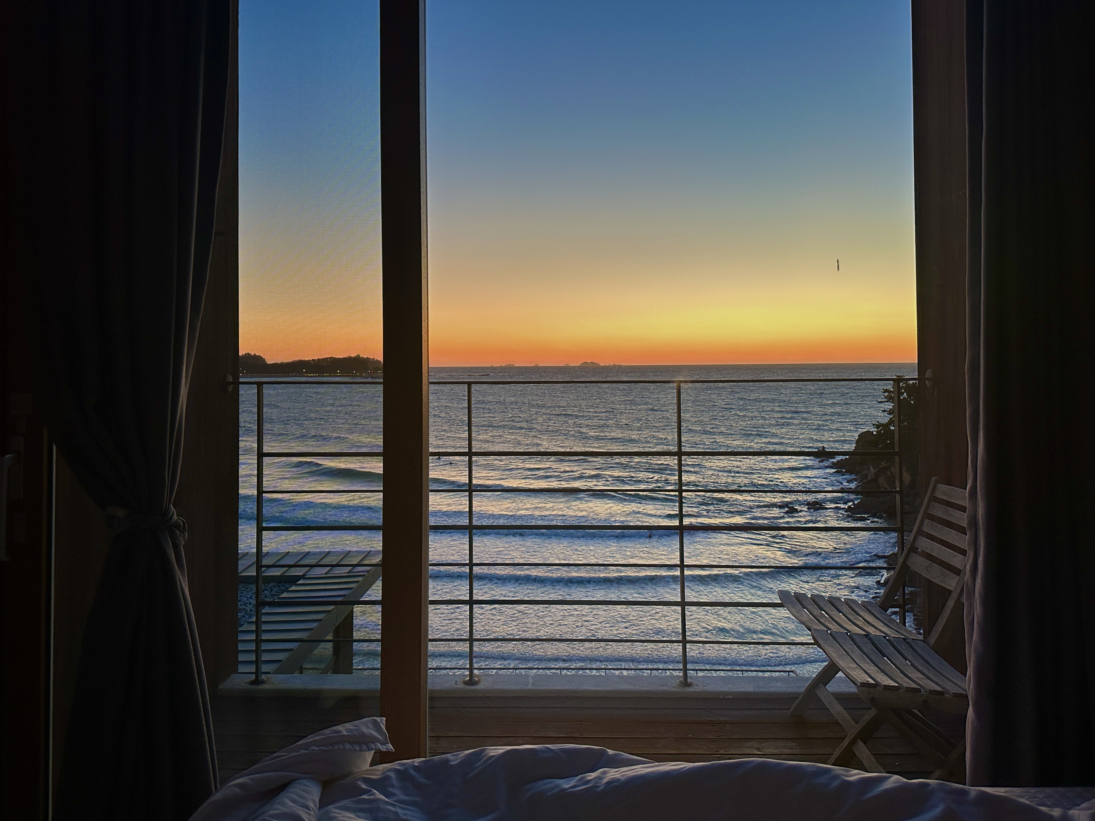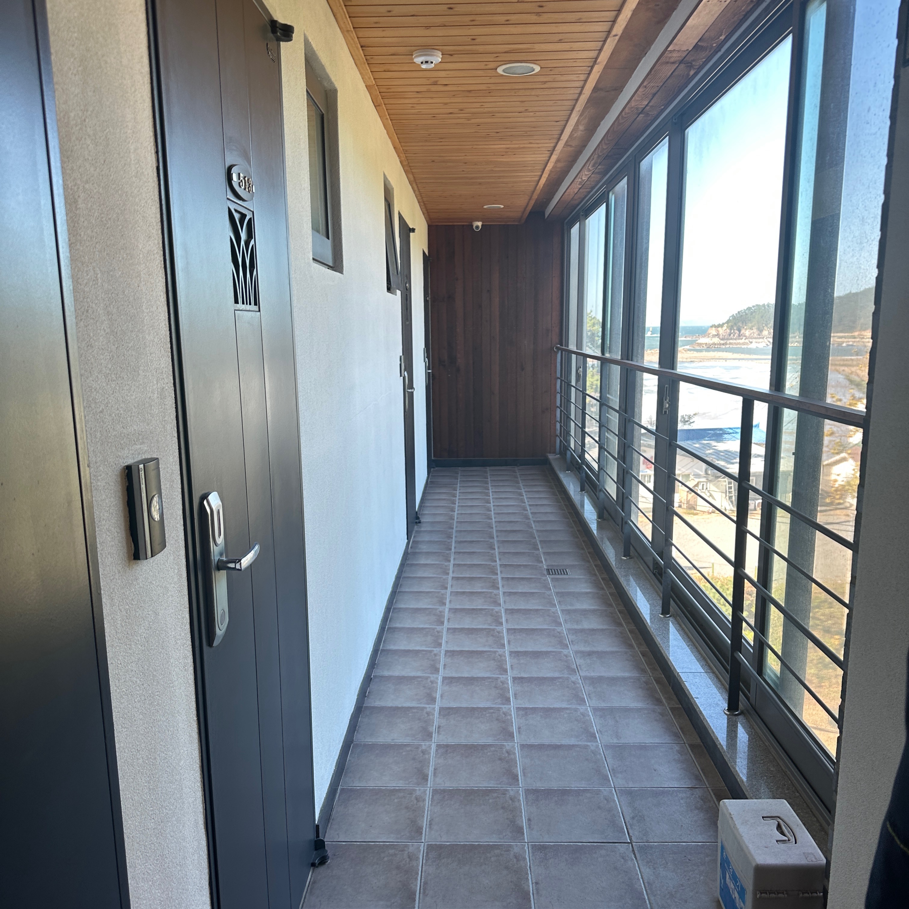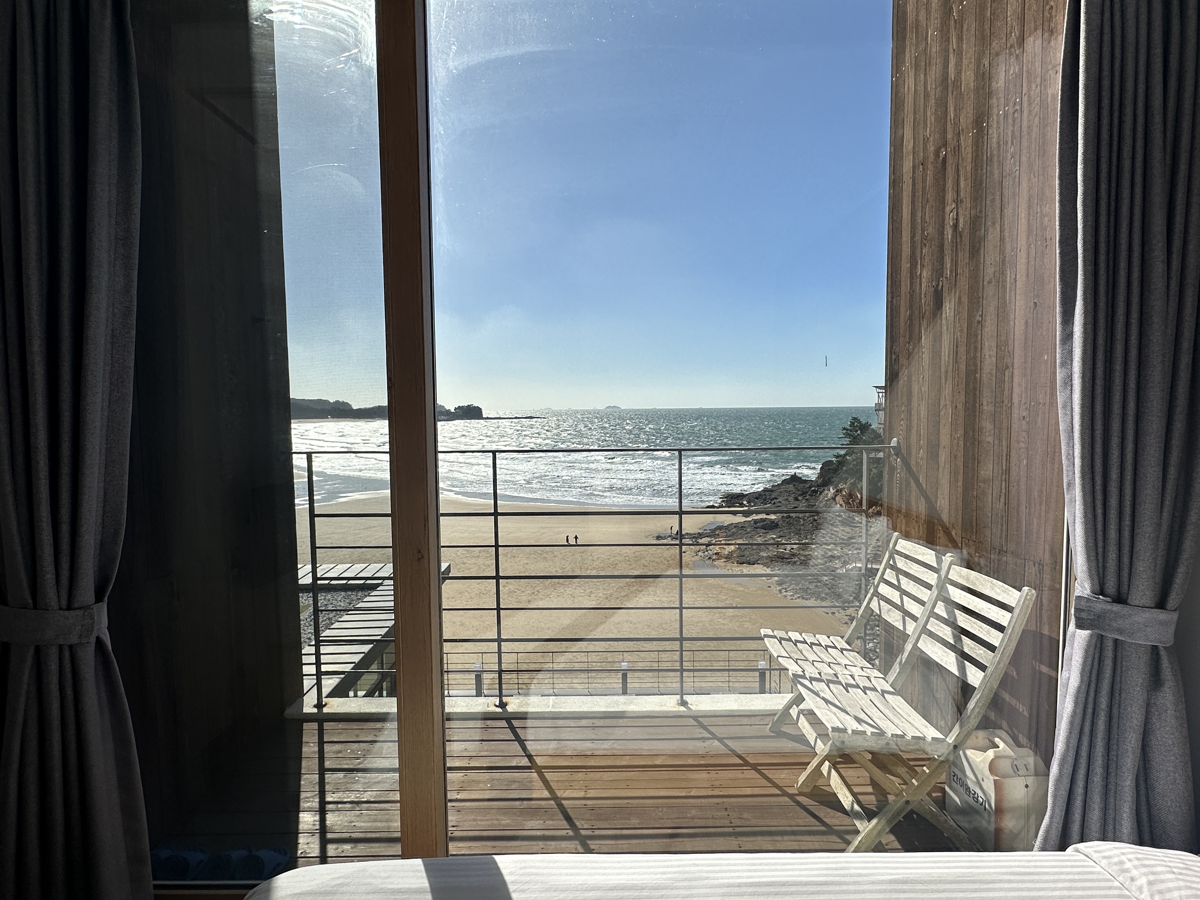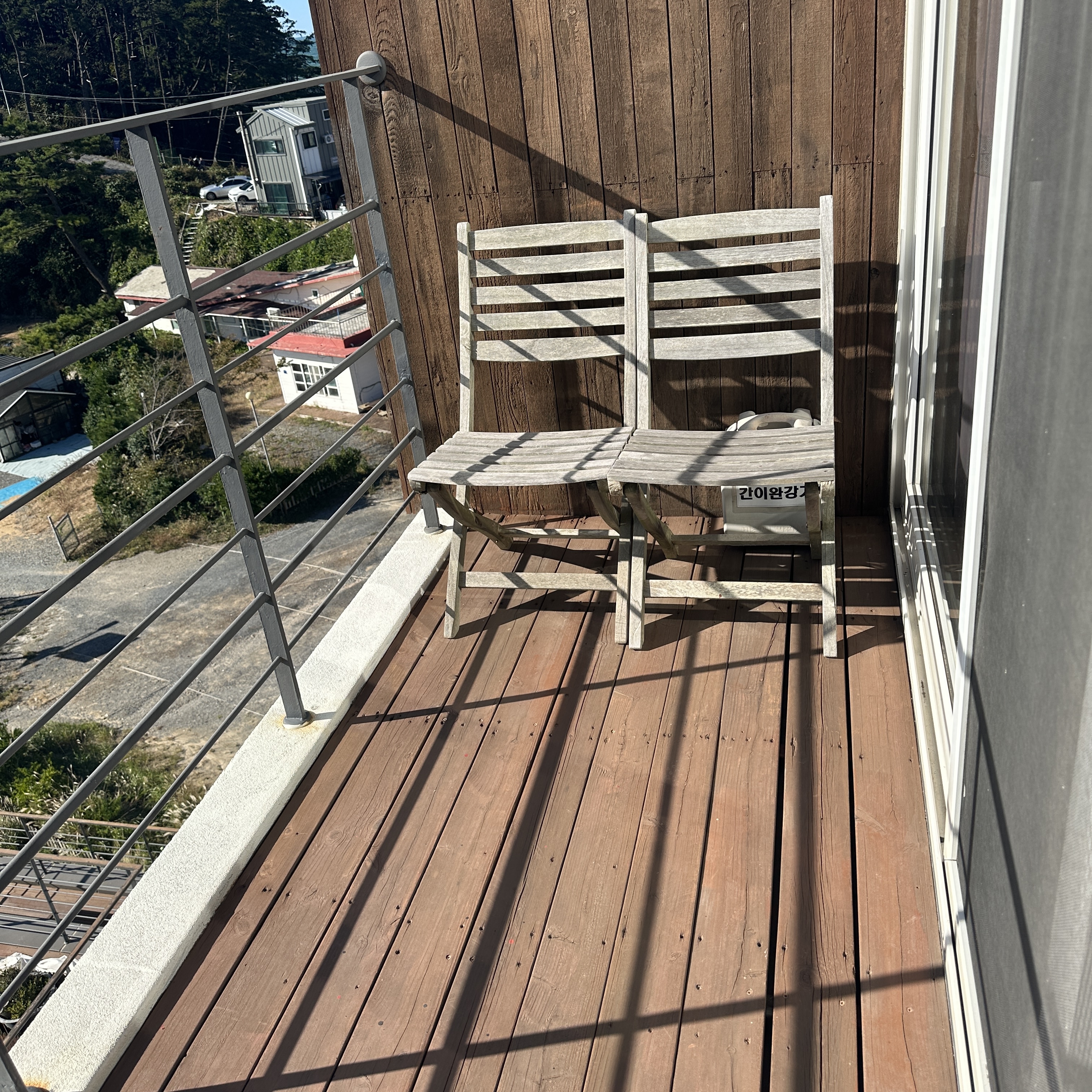 베란다 문을 열면 의자 2개가 놓여진 테라스도 있는데 바닷바람 맞으면서 경치 구경하기 좋아요🫶