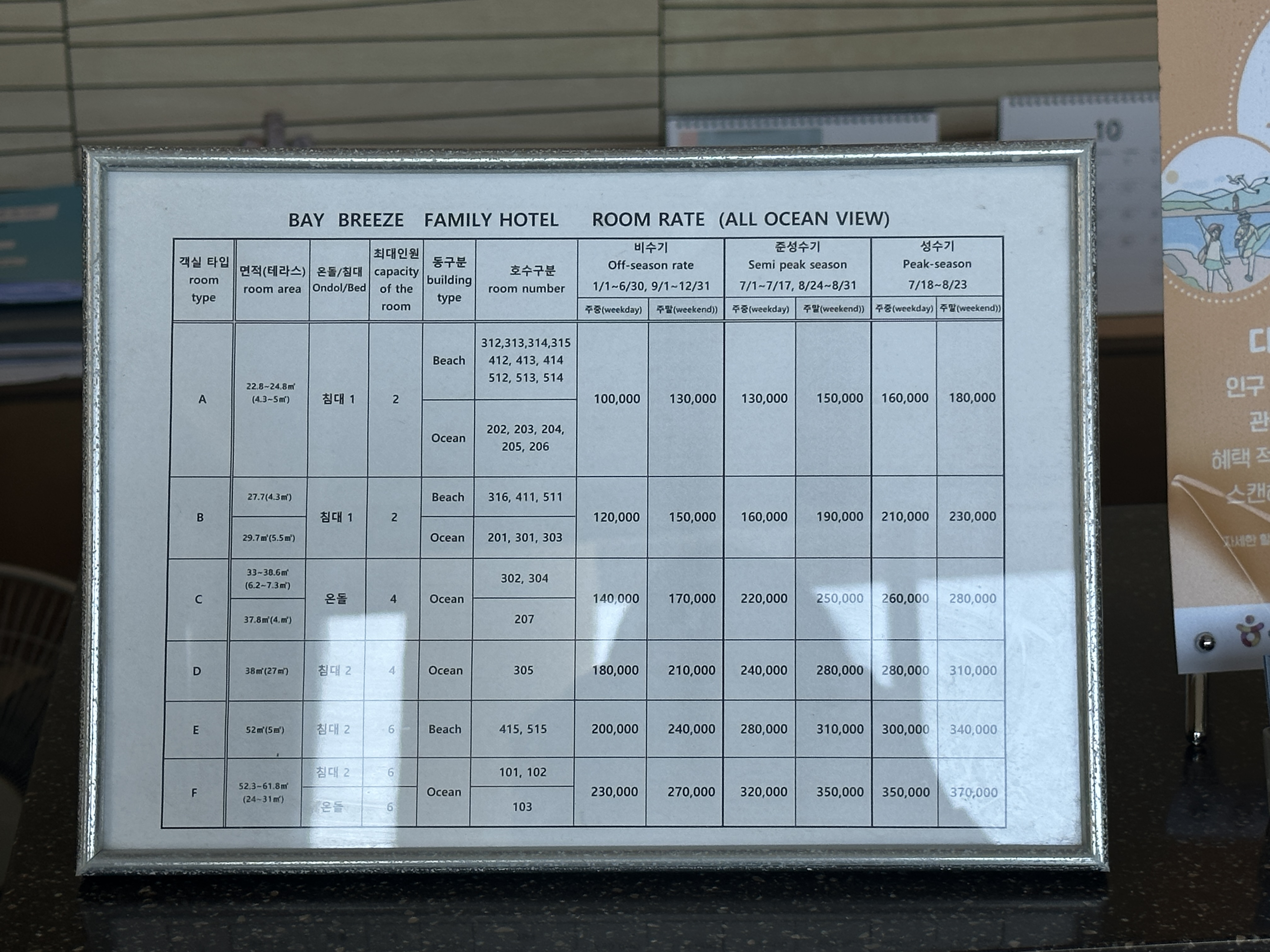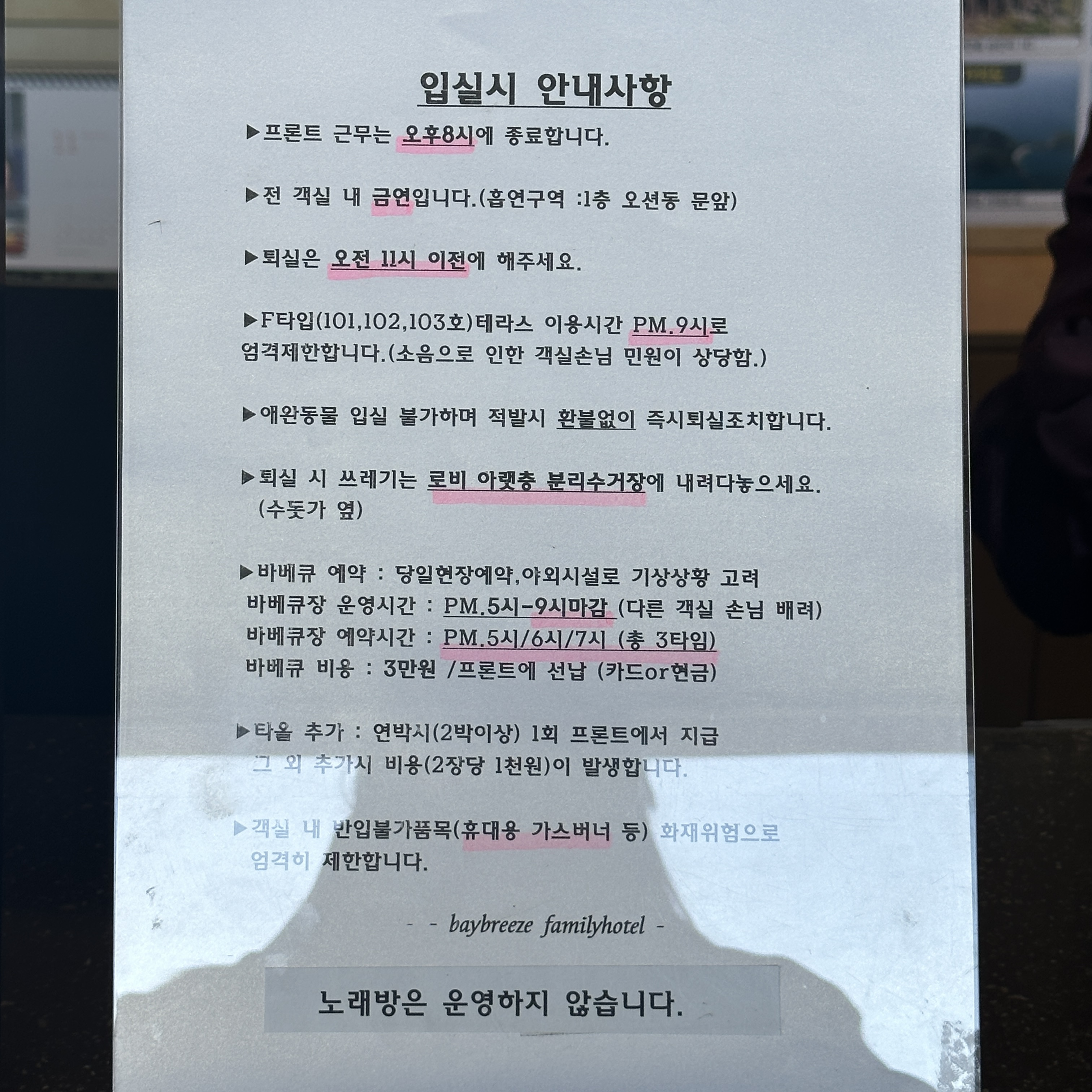 입실 시 주의사항과 객실 요금은 프론트에 비치되어 있으니 확인해 주세용!