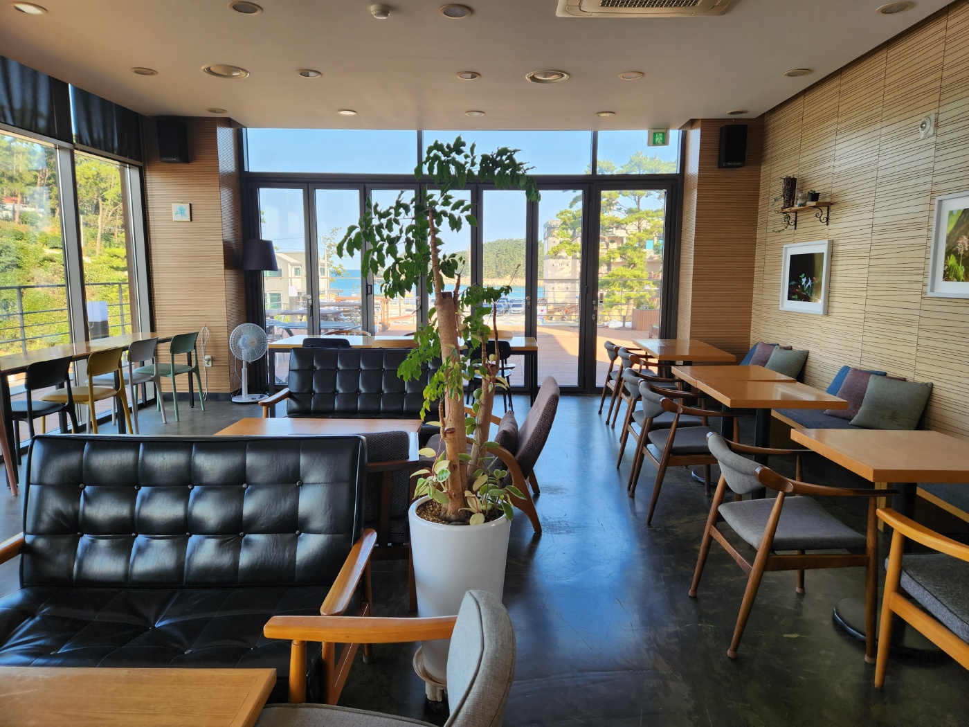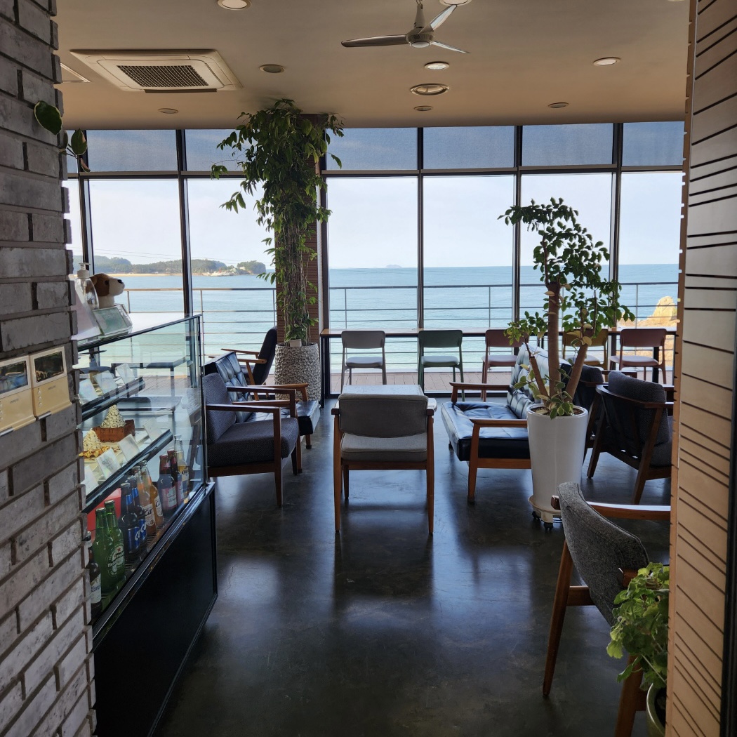 들어가자마자 보이는 확트인 창문 너머에 바다가 보이고 오전이라 그런지 카페 오픈 준비를 하고 계셨어요