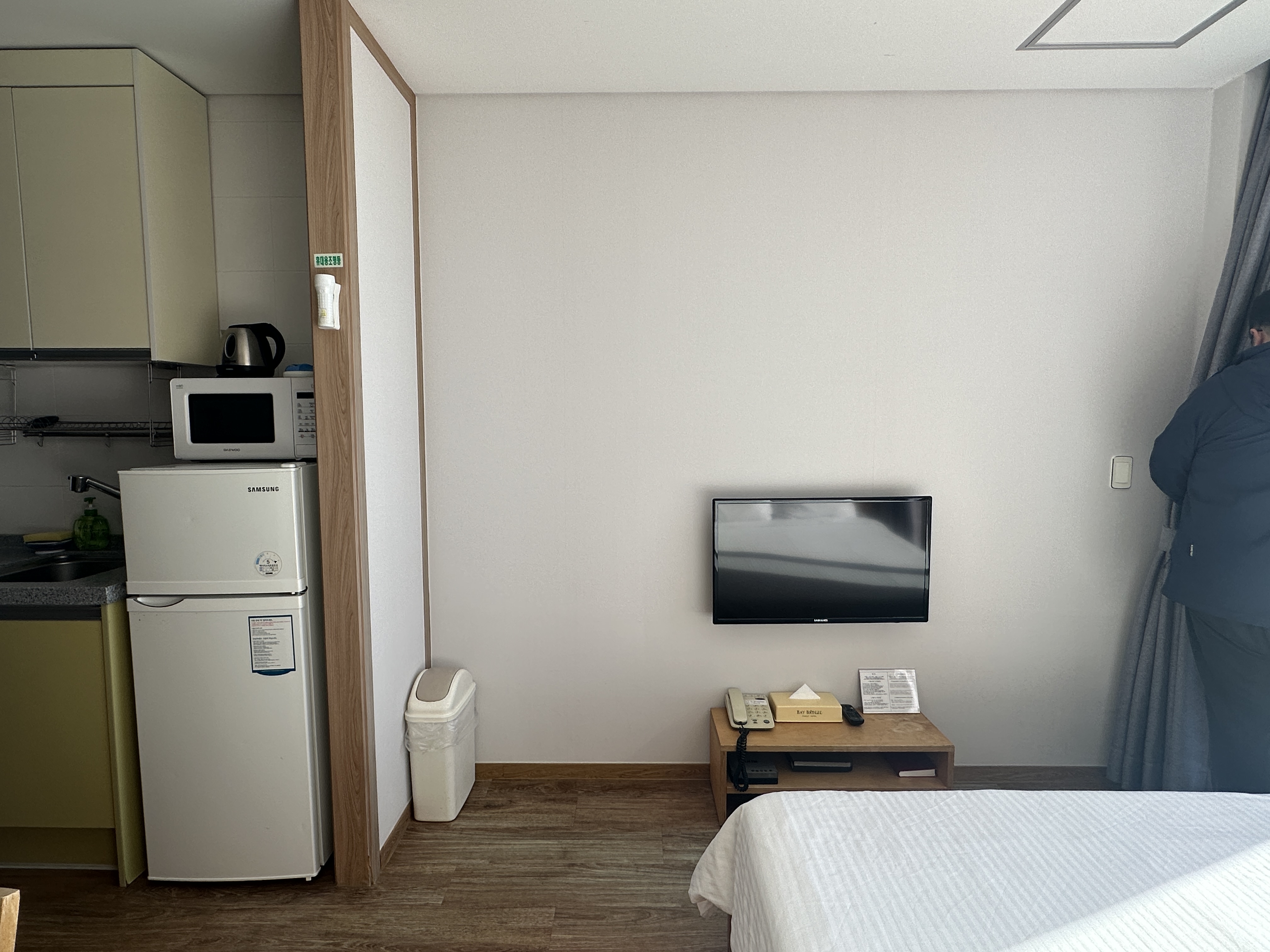 침대 옆에 식탁테이블이 있어서 간단히 식사하거나 쉬기에 좋았어요. TV는 생각보다 작지만 유플러스 채널이 있어서 예능이나 영화 보기에 적절히 좋았어요! (옆에 펼쳐진 오션뷰가 있는데 TV가 눈에 들어 오겠습니까아ㅠㅎ)