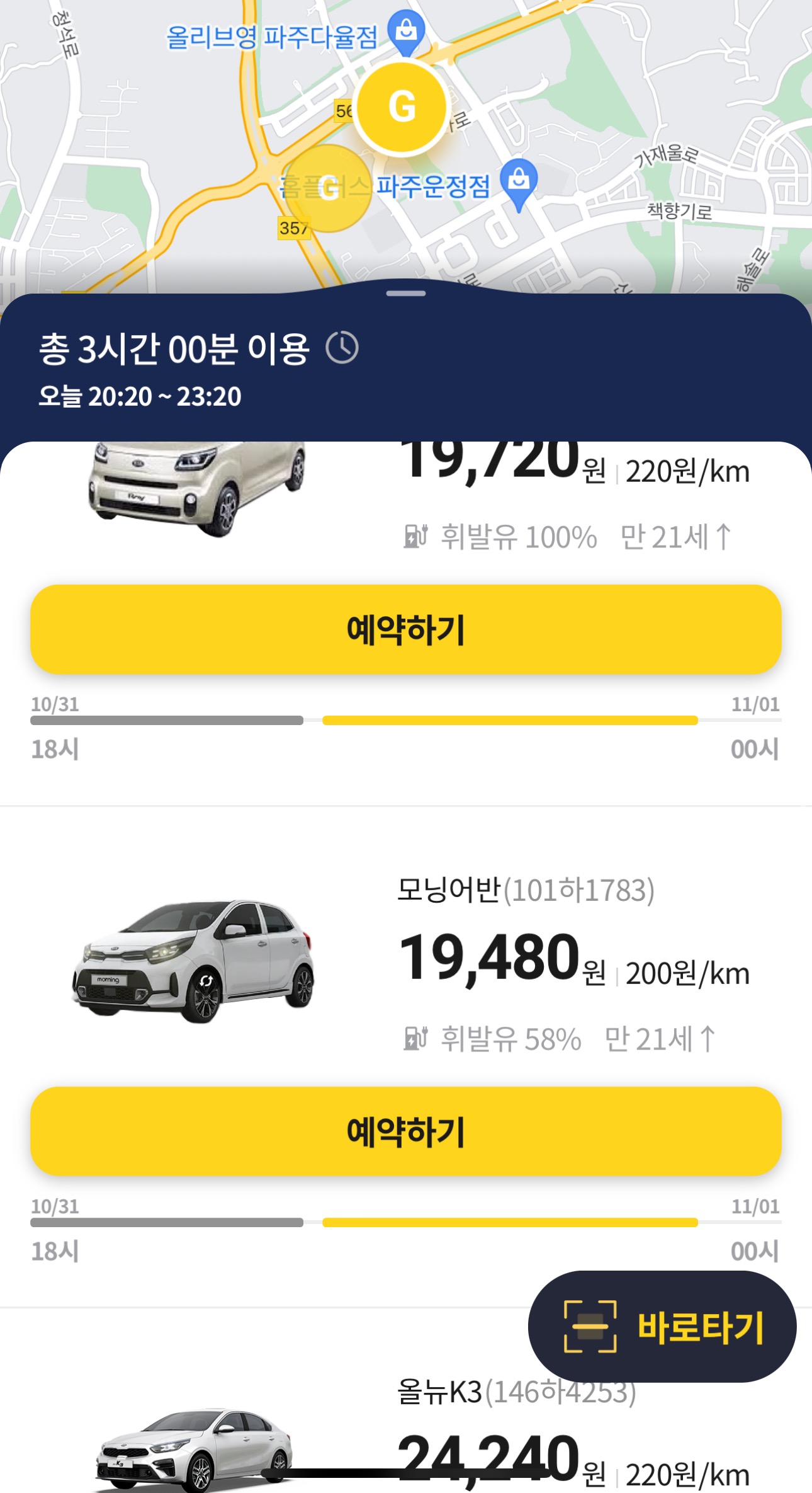 승인 문자를 접하고 바로 행복카 위굴리 앱에 들어가서 원하는 차량을 탐색한 후 시간 예약 완료