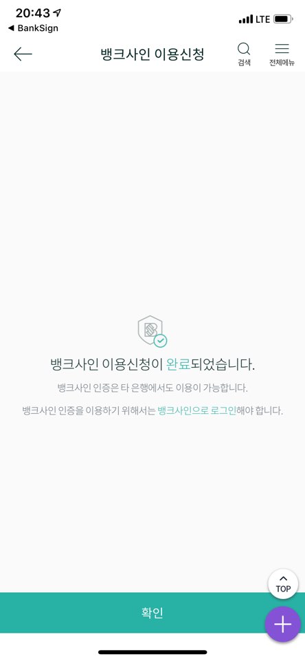 5. 뱅크사인 이용신청을 위한 모든 약관동의가 필요해요. 전체동의 눌러주시고 확인까지 눌러주시면 됩니다.