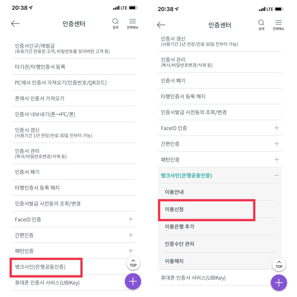1. keb 하나은행 앱 접속 후 오른쪽 상단에 전체메뉴 클릭-> 인증센터를 아래 경로와 같이 들어가 줍니다.